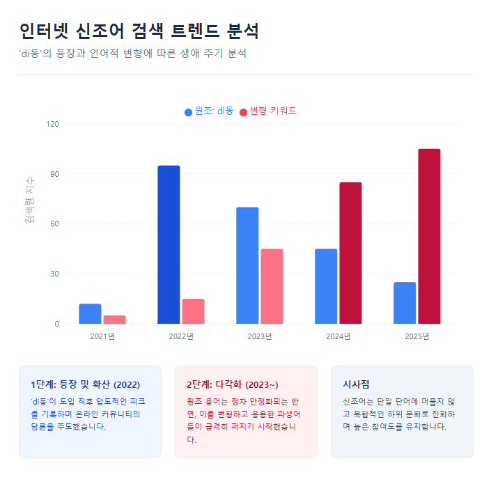 di동 은어는 플랫폼 필터와 검색 제한으로 직접 키워드가 차단되면서 사용자들이 창의적으로 만든 필터 회피 단어입니다. 특정 조합으로 의미 전달하면서도 자동 필터를 피하며 커뮤니티 은어 문화의 전형입니다. 2026년에도 변형 키워드가 계속 등장하며 인터넷 신조어 분석에서 빠질 수 없는 사례입니다.